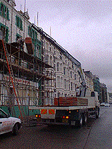 | Facade Access Scaffold For Painting - Metropole Hotel, Llandridnod Wells | Lorry Mounted Crane - Used To Lift Materials To Working Platform | Modex System Staircase - Ideal For Public Or Site Access |